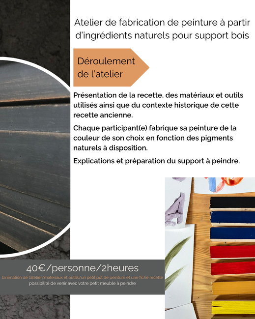 Venez apprendre à créer votre propre peinture pour le bois (porte, fenêtre, bardage, meubles extérieurs, ...) à base de produits naturels. C'est sain, c'est beau et c'est pas cher. Vous repartez avec la recette, la technique et un petit pot pour reproduite chez vous. (création de peinture pour retaper un meuble le 7 décembre).