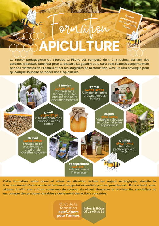 En partenariat avec des maraîchers, paysagistes et jardiniers spécialisés, dont le CAUE : journées de formation suivi d'un chantier participatif : concevoir une mare paysagée, fleurir des sous-bois, planter une bordures et une haie nourricière, concevoir et entretenir un jardin jungle, mais aussi des séances sur la gestion de l'eau, le paillage, la nature des sols, les associations au potager, les slow tech, la culture en buttes, la philosophie de vie